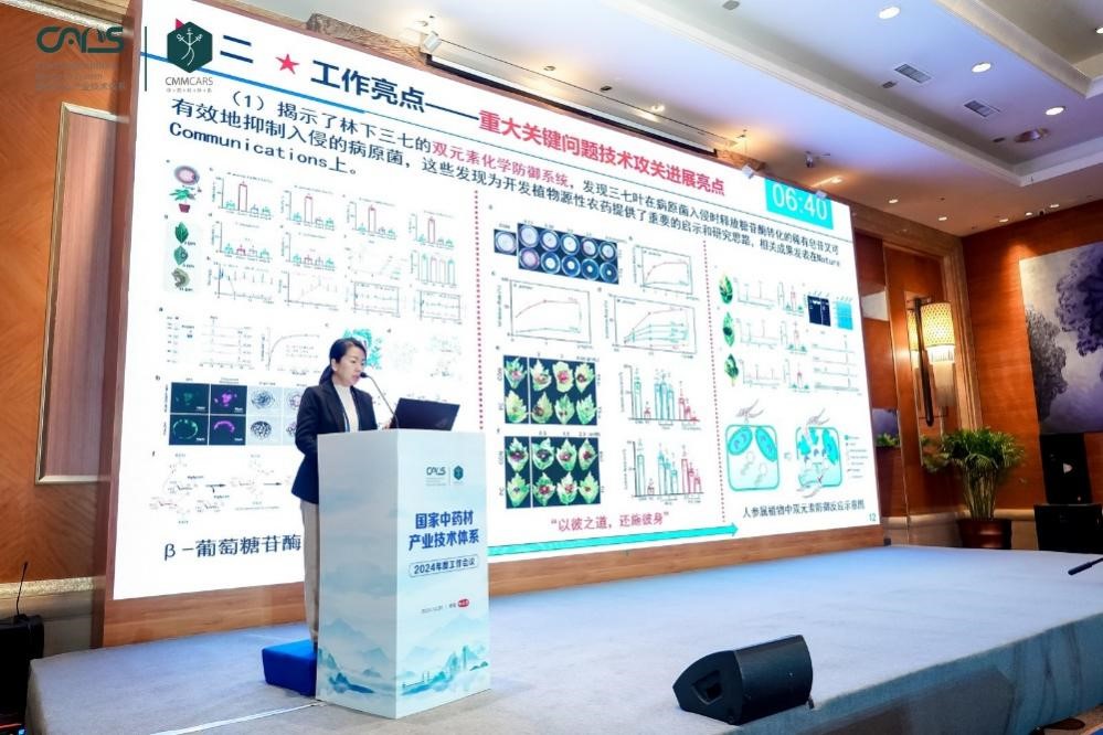 何霞红教授,作为病虫草害防控研究室主任,她带领的团队详细介绍了团队在过去一年在中药材病害防控领域取得的工作进展和成就,包括三七病虫害防治方面的创新研究、技术规范的制定、以及基地建设培训服务等。