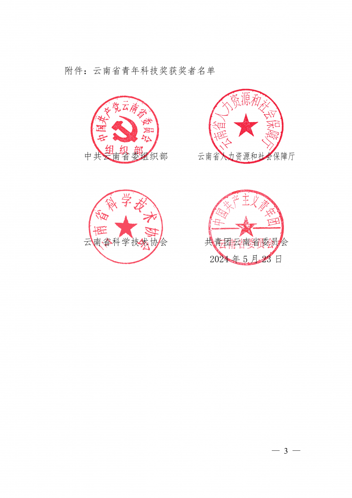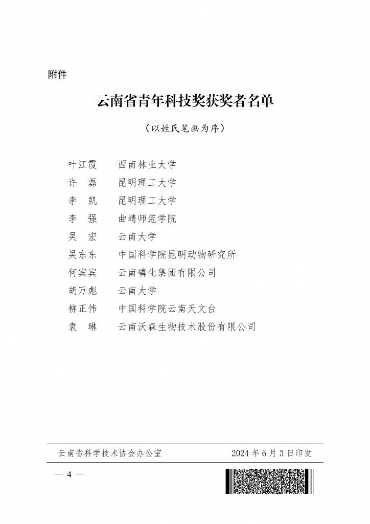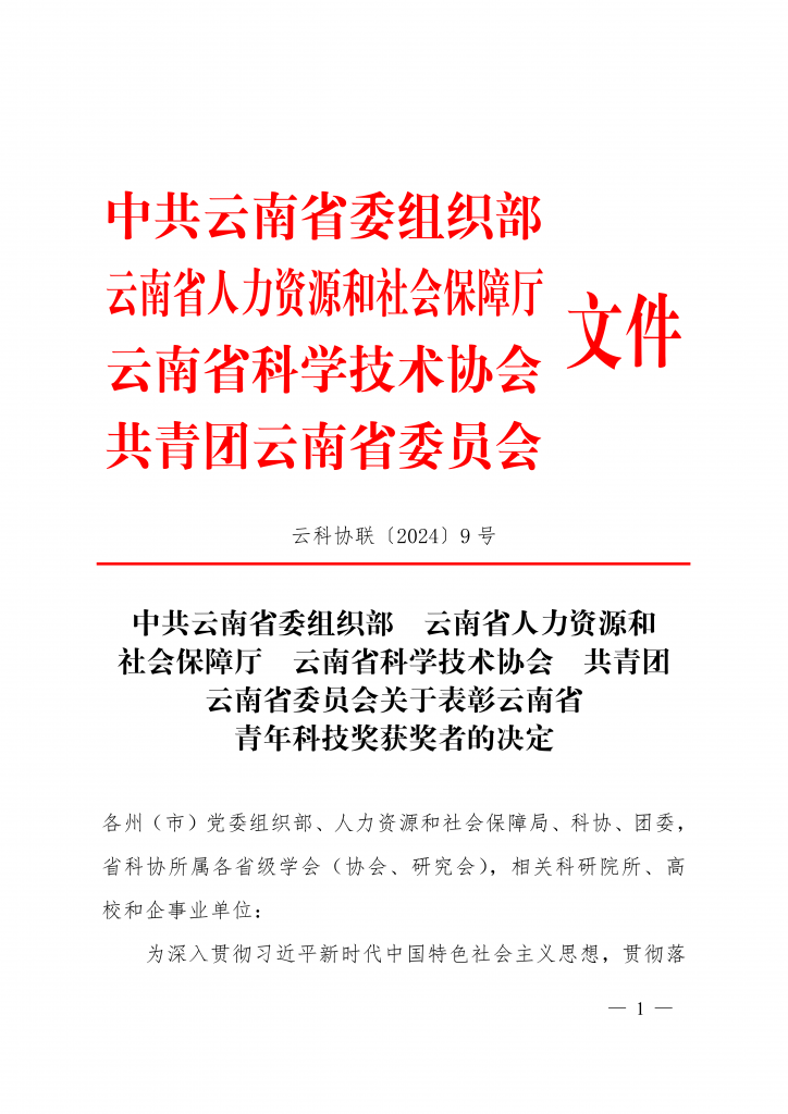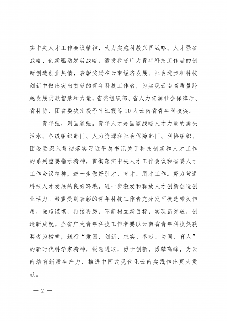 为深入贯彻习近平新时代中国特色社会主义思想,贯彻落实中央人才工作会议精神,大力实施科教兴国战略、人才强省战略、创新驱动发展战略,激发我省广大青年科技工作者的创新创造创业热情,表彰奖励在云南经济发展、社会进步和科技创新中做出突出贡献的青年科技工作者,为实现云南高质量跨越发展贡献智慧和力量,云南省委组织部、省人力资源社会保障厅、省科协、团省委决定授予叶江霞等 10 人云南省青年科技奖。