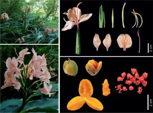 该植物新种于2015年由贵州省望谟县林业局黄江华首次拍摄,后由122cc太阳成集团与仲恺农业工程学院合作开展五年多的调查研究。此种姜花的花形硕大,色彩艳丽,与已有的野生种类在形态上差异较大。经过文献研究进行国内外种类和品种比对,数次野外分布和生境调查、访谈调查求证,并进行野外活体和引种栽培个体的形态学比对研究,确定该植物为姜花属的新种,将其命名为“望谟姜花Hedychium wangmoense F.J. Mou & X. Hu”(图1)。发现其形态特征与纯白色的圆瓣姜花(Hedychium forrestii Diels)相似,但小花具有硕大的橙粉色花冠;望谟姜花的花色艳丽,橙粉色与红姜花(Hedychium coccineum Buch.-Ham. ex Sm.)相近,但花形硕大,且唇瓣发达,株型也较矮而紧凑。新种望谟姜花的形态特征综合表现优良,为姜花属植物的种质资源创新提供了优良的亲本材料。文中还提供了中国产姜花属32个种、变种的分种检索表。