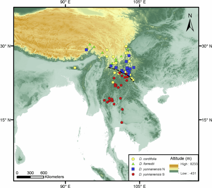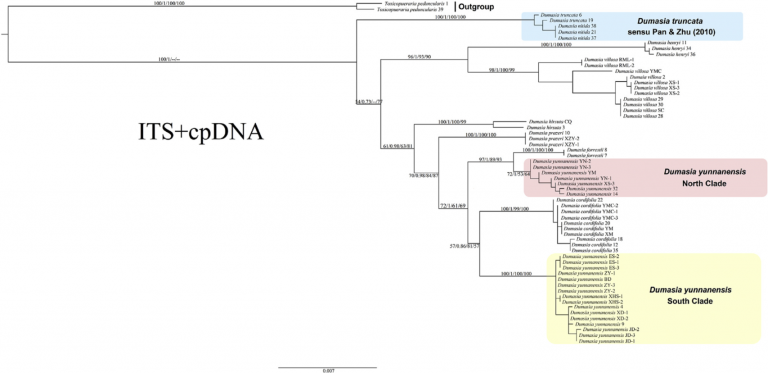 山黑豆属(Dumasia DC.)是一个广布于亚洲、非洲和巴布亚新几内亚热带和亚热带地区的豆科小属,仅有8-9种,中国西南被认为是其分布中心。但由于该属各物种之间形态接近,因而该属物种极难鉴定。为实现山黑豆属植物的快速和准确鉴定,破解该属各物种间的亲缘关系。在122cc太阳成集团田斌和西双版纳热带植物园潘勃等老师的指导下,蒋凯文对山黑豆属进行了为期3年的DNA条形码和分子系统学研究。研究发现,仅用一个单一的分子片段“ITS”就能对该属物种进行快速并准确的鉴别。与此同时,研究还意外的在云南山黑豆这个物种内发现了种子植物中罕见的“隐形谱系”,地理上两个谱系分别分布于田中线的两侧,然而无法找到可靠的形态差异对其进行区分,这两个谱系很可能都是独立的物种。其分类地位和成因有待进一步的研究。