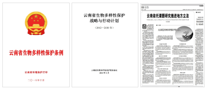 主持编制全国首部生物多样性保护地方性法规《云南省生物多样性保护条例》,开创立法先河,为西南生态安全屏障构建提供制度支撑;编制《云南省生物多样性保护战略与行动计划(2012-2030)》,通过9大领域34项行动,支撑国家生态战略与全球生物多样性目标落地。