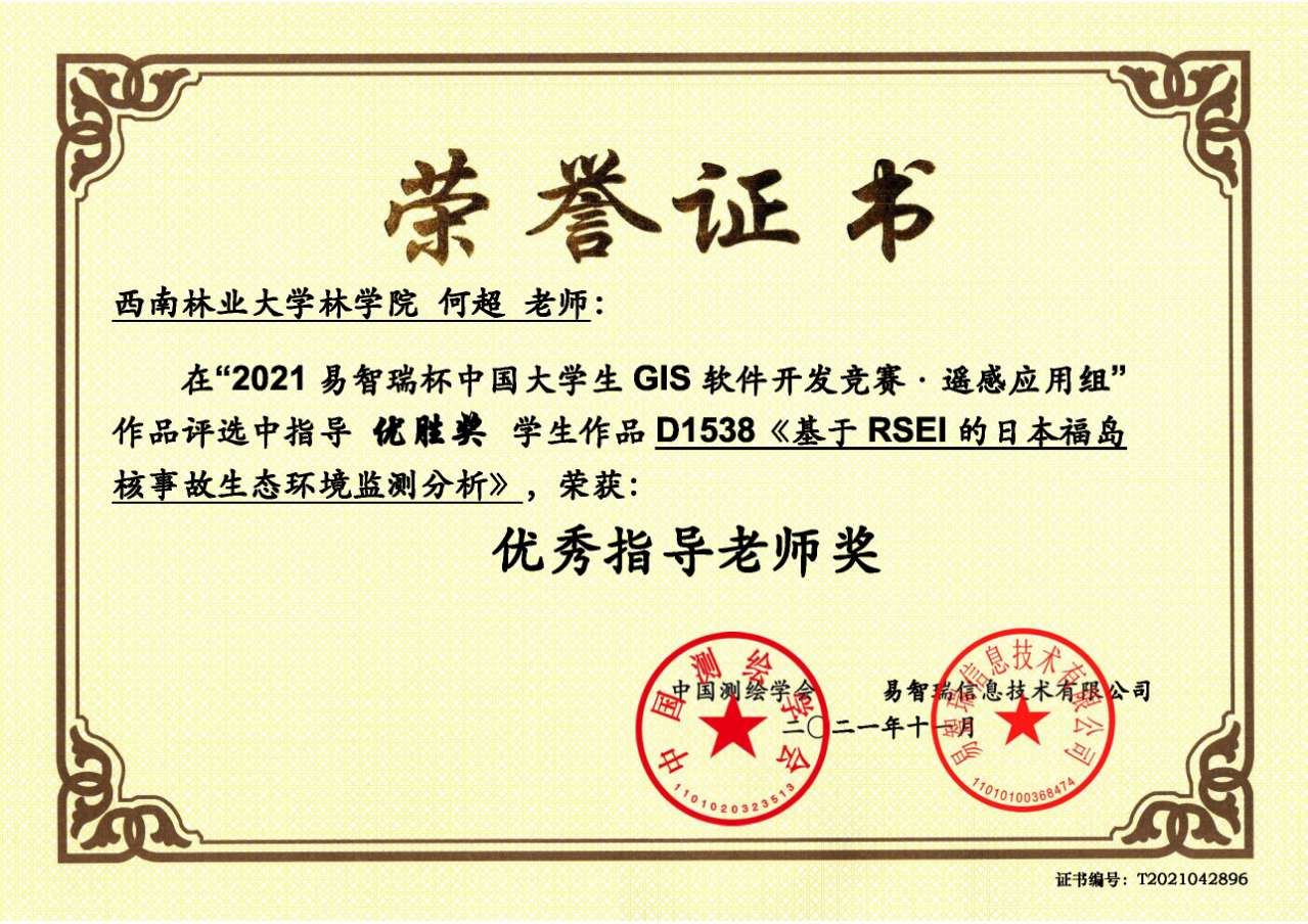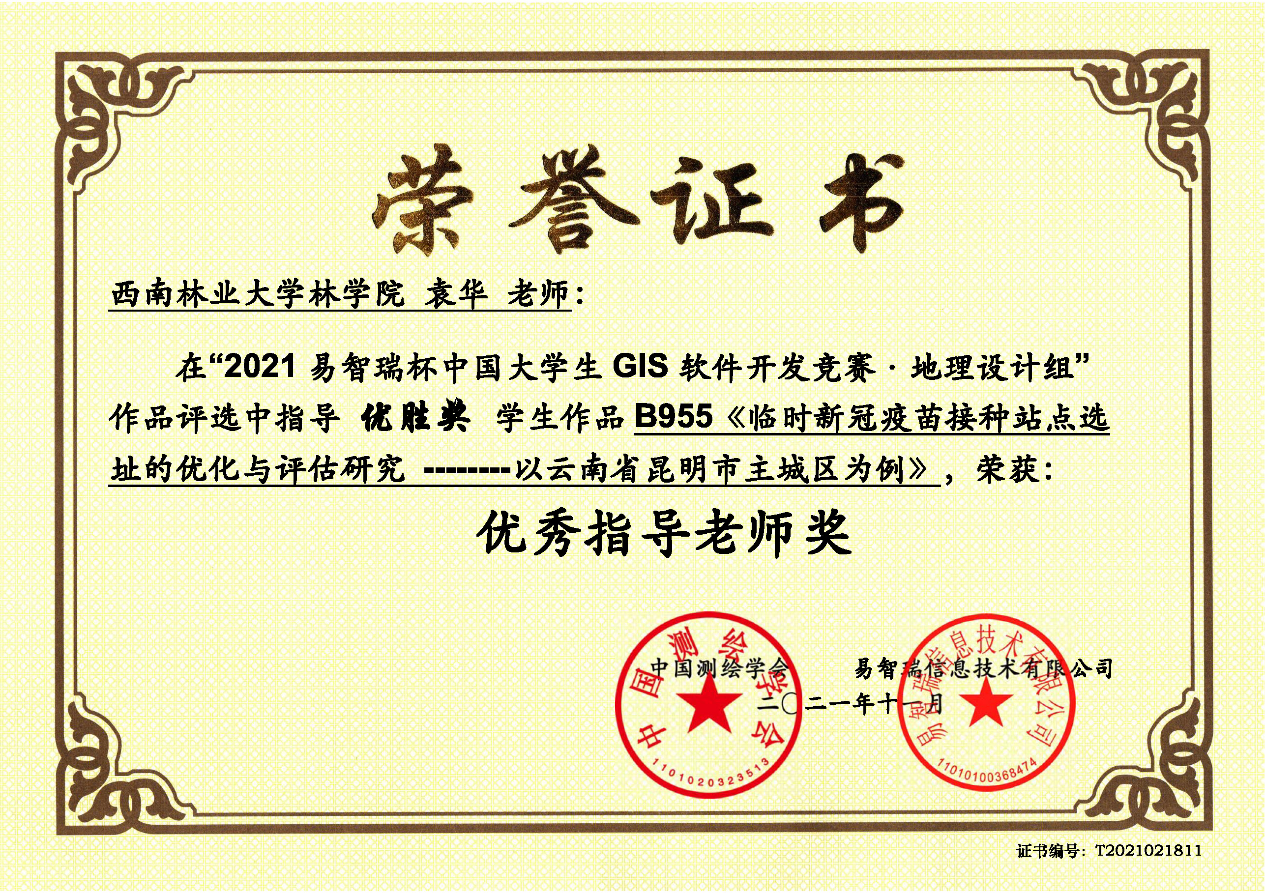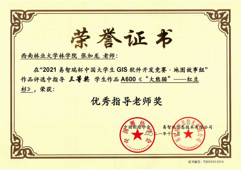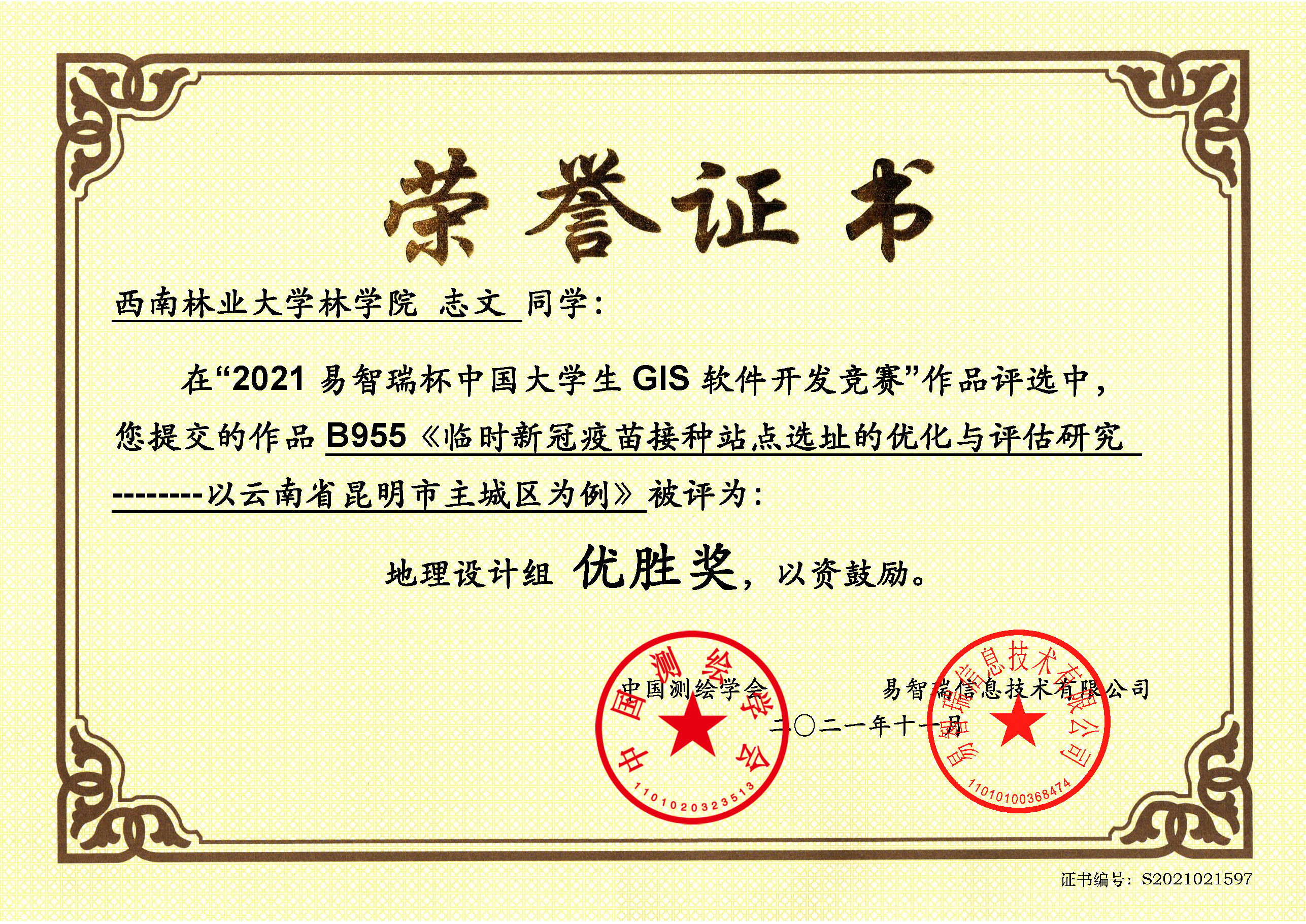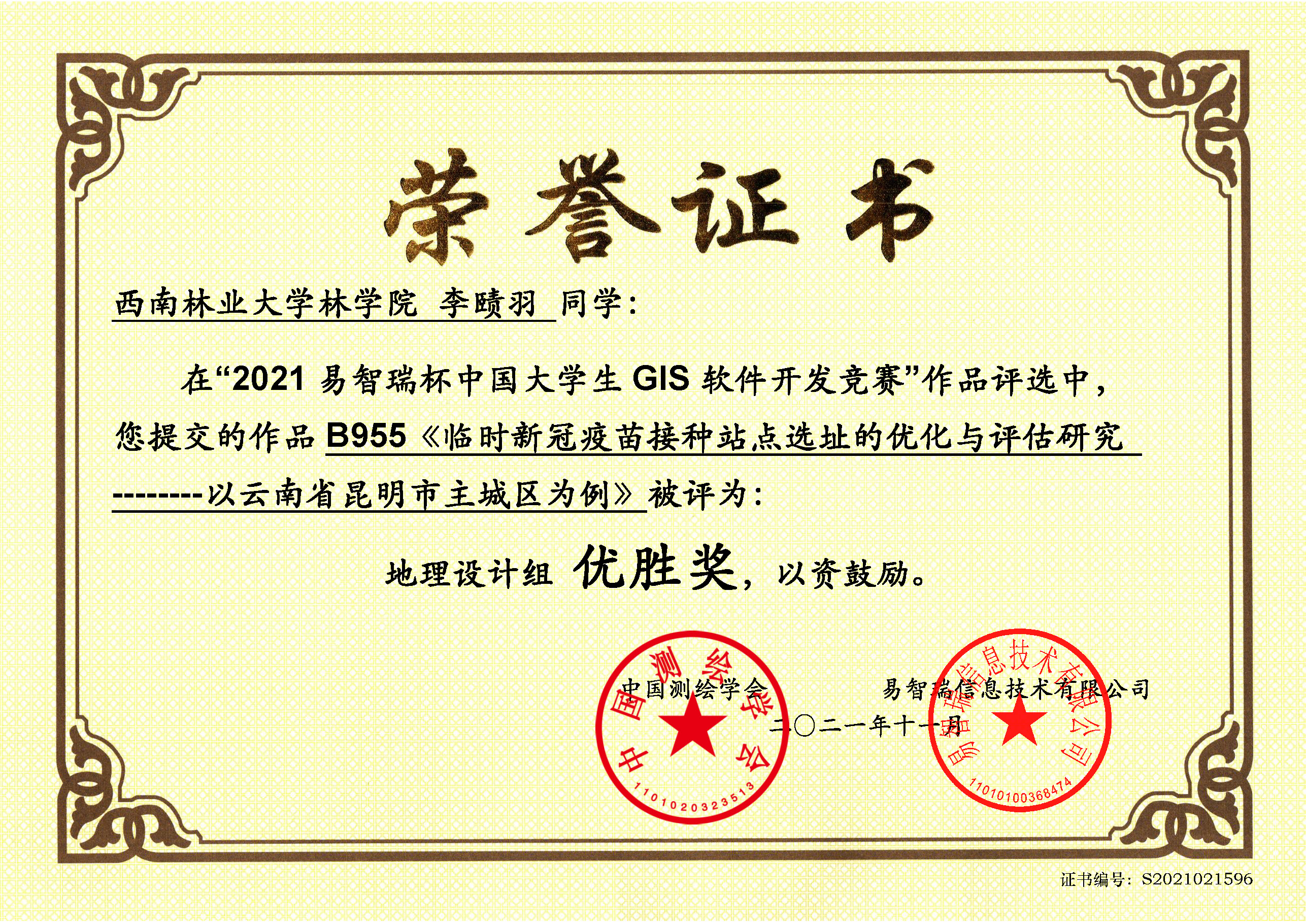 122cc太阳成集团2019级地理信息科学专业彭愉溪、李赜羽、志文、张涛、张昊、李洁瑞、范乐天、郝悦竹、史丰邈、崔旌帅等同学,在森林经理学教研室各位老师的指导下在2021年易智瑞杯中国老员工GIS应用开发组、地图故事组、遥感应用组分获三等奖、优胜奖等奖项。