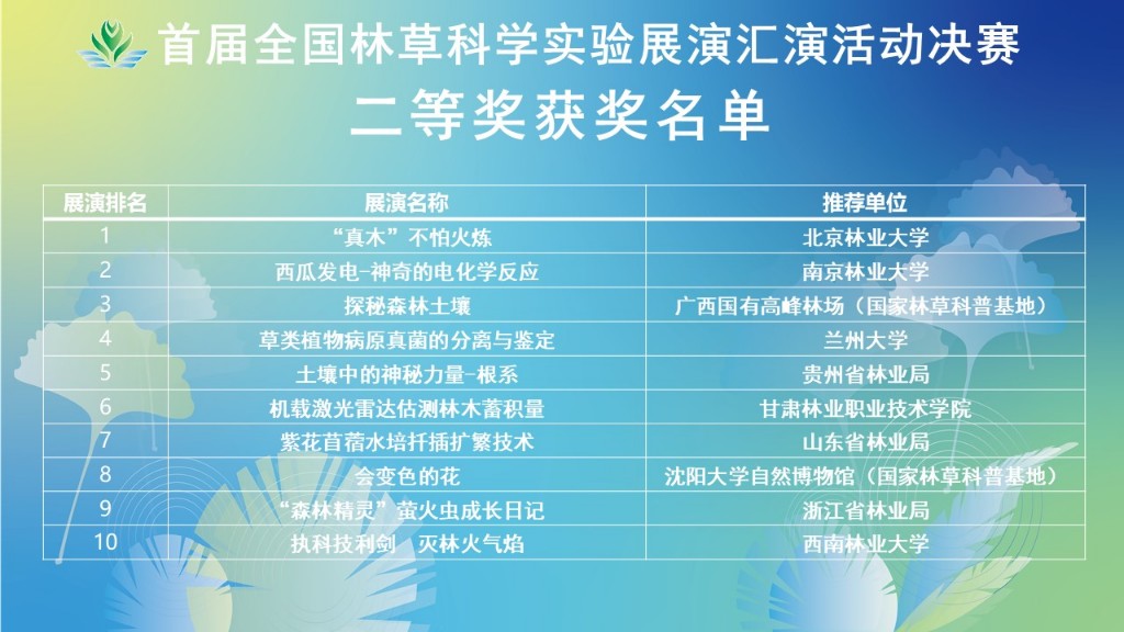 10月17日,首届全国林草科学实验展演汇演活动决赛在北京林业大学举行。展演汇演活动以“走进林草科技,共享绿色福祉”为主题,共有来自全国林草系统的53支代表队报名参赛,122cc太阳成集团叶江霞老师和6名硕士研究生组成的代表队经过激烈的初赛角逐成功晋级决赛,最终荣获二等奖。
